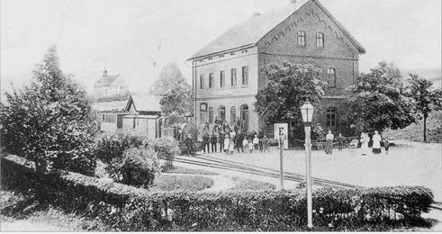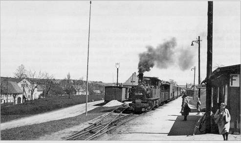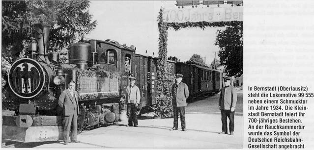 Im Jahre 1922 erhielt das Empfangsgebäude in Bernstadt (Oberlausitz) den im Vordergrund zu sehen- den Holzanbau. Im Hintergrund steht der Lokomotivschuppen, davor warten auf dem Abstellgleis Reisezug- und Güterwagen auf den nächsten Einsatz. Die vor dem Zug stehende Lokomotive der ehemals sächsischen Gattung I K wird auf der Strecke nicht mehr lange fahren