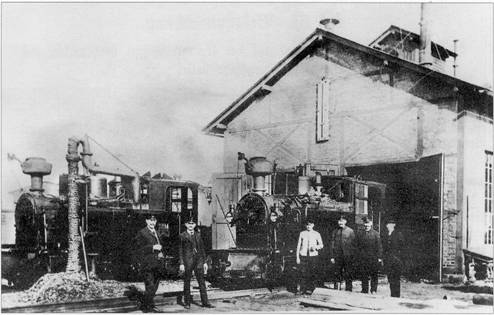 Vor dem Maschinenhaus in Bernstadt (Oberlausitz) steht links die Lokomotive 14, die auf der Strecke nach Herrnhut von 1896 bis 1924 fuhr. Daneben befindet sich die "leicht rauchende" Lokomotive 15